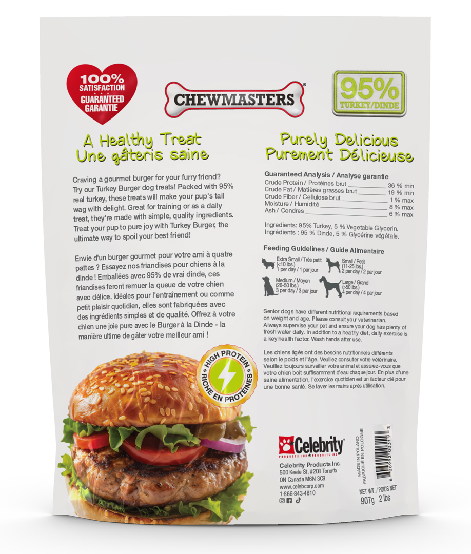 Offer your clientele the ultimate indulgence with our Gourmet Turkey Burger dog treats. With a composition of 95% real turkey, these treats are the pinnacle of taste and quality, shaped into convenient slider patties for easy feeding. Ideal for businesses looking to provide premium, healthy options, these Turkey Burger treats are a testament to simplicity and nutritional value, designed to captivate and satisfy any canine palate.
